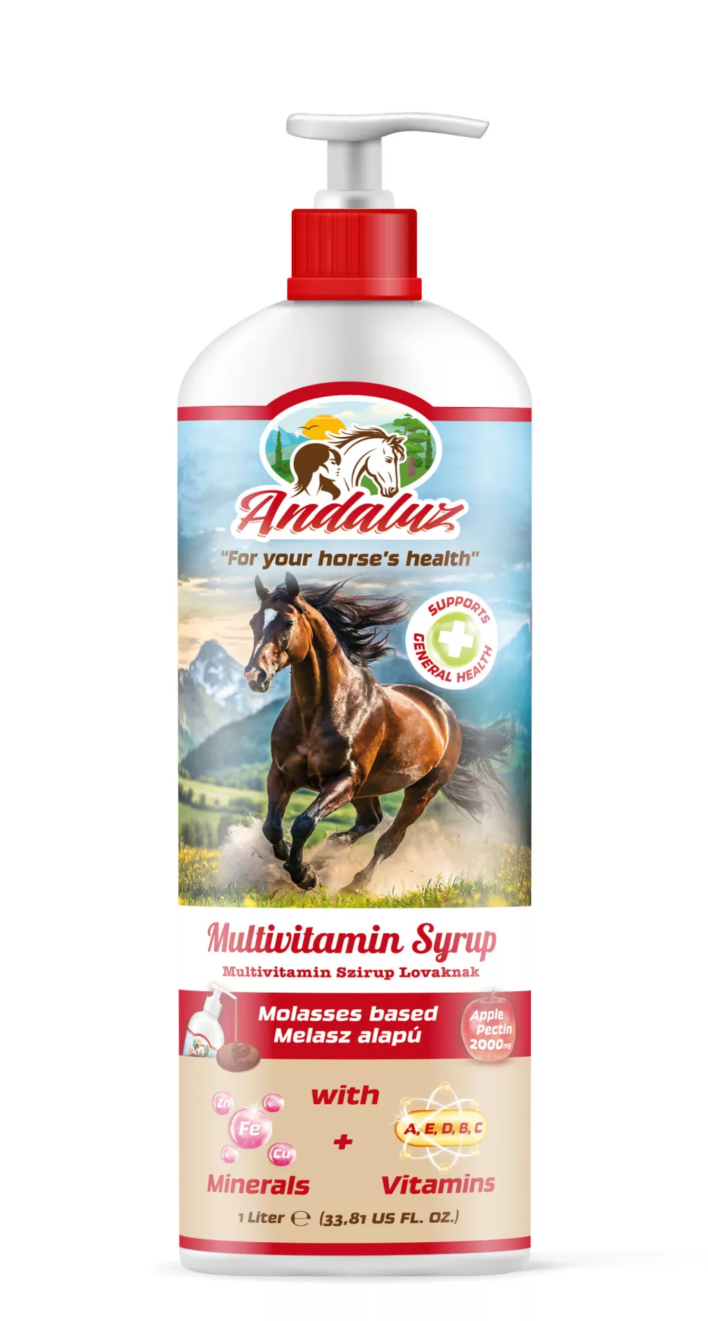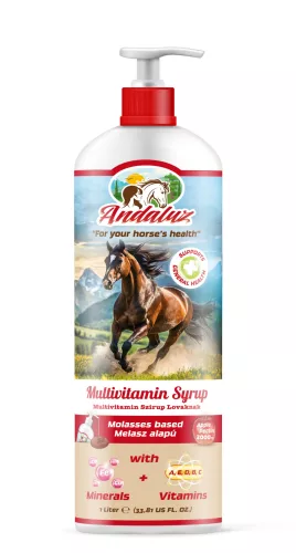 Andaluz multivitamin szirup létfontosságú vitaminok és nyomelemek kombinációja révén optimális módon egészíti ki a ló napi alaptakarmányát. A ló fontos anyag-csere folyamatát élénkíti ezáltal növeli a teljesítő képességet! Cukorrépa melasz tartalma miatt étvágyjavító és az állat önként fogyasztja.
