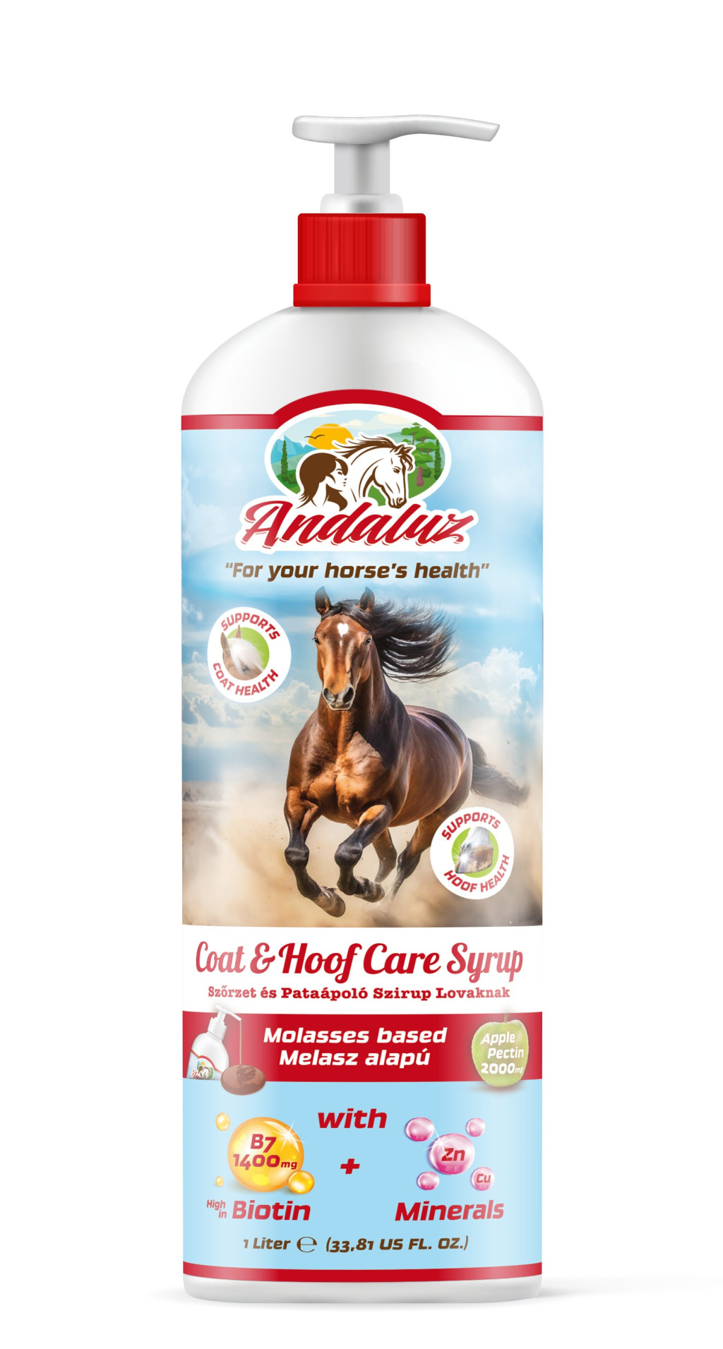 Andaluz szőrzet és pata ápoló szirup a hozzáadott biotin, metionin valamit cink,- réz glükonát megfelelő kombinációja révén hozzájárul az egészséges szaru képződéshez. Segít fenntartani a paták és szőrzet egészségét, használatával elkerülhető a paták repedezése, törékenysége és más problémái.