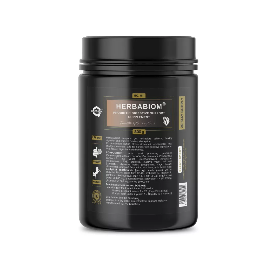 A HERBABIOM® egy komplex probiotikus, prebiotikus és posztbiotikus takarmánykiegészítő lovak számára, amely célzottan támogatja az emésztőrendszer egyensúlyát és a bélflóra egészségét. Élő tejsavbaktériumokkal (Enterococcus faecium, Lactobacillus plantarum, Pediococcus acidilactici), élő élesztővel (Saccharomyces cerevisiae), prebiotikus oligofruktózzal (FOS), és természetes posztbiotikummal (inaktív élesztő sejtfal) segíti a bélmikrobiom egyensúlyát és az immunrendszer megfelelő működését.