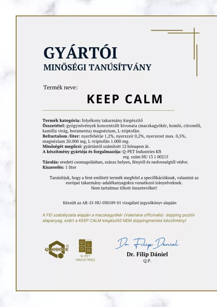 A KEEP CALM nem gyógyszer, nem egy klasszikus nyugtató, hanem a lovak idegrendszerére ható gyógynövények kivonata, ami megemeli a lovak ingerküszöbét, ezáltal kezelhetőbbé téve őket.