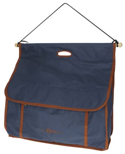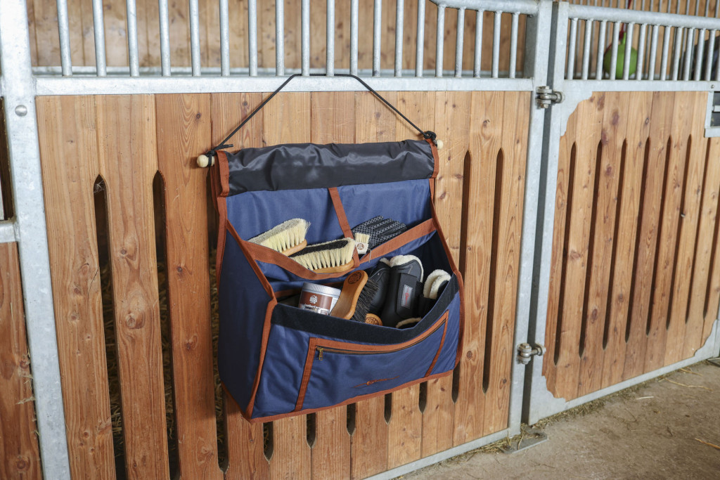 Tartós és praktikus táska, amelyben rendszerezetten tárolhatja az ápoláshoz szükséges eszközöket, lábszárvédőket, kötőfékeket, stb. az istállóban, vagy a versenyeken.