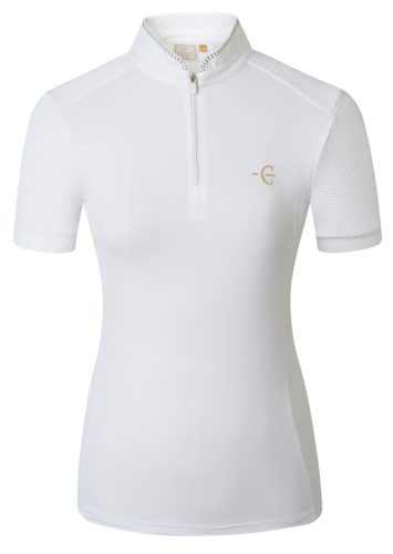 Versenypólónk ötvözi a sportos teljesítmény a stílusos megjelenéssel. A szellőző, rugalmas anyag optimális viselési kényelmet és maximális mozgásszabadságot biztosít a nyeregben. A vonalvezetés kiemeli az alakot, míg az elegáns, diszkrét csillogó kövekkel kirakott állógallér elegáns megjelenést biztosít.