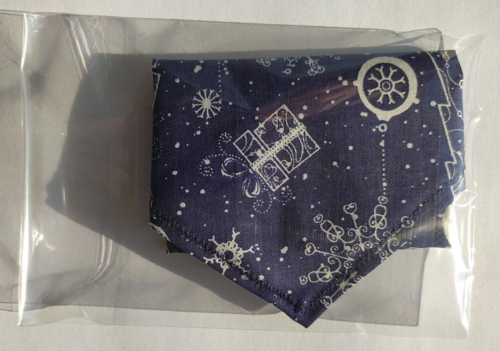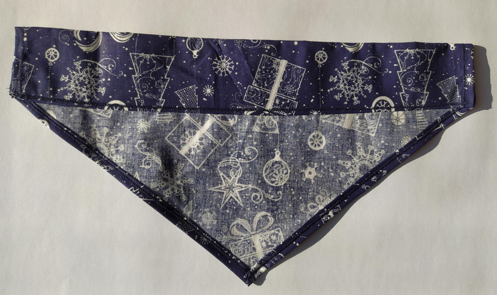 Kék színű, karácsonyi mintás pamutvászon kendő kutyáknak - méret: S